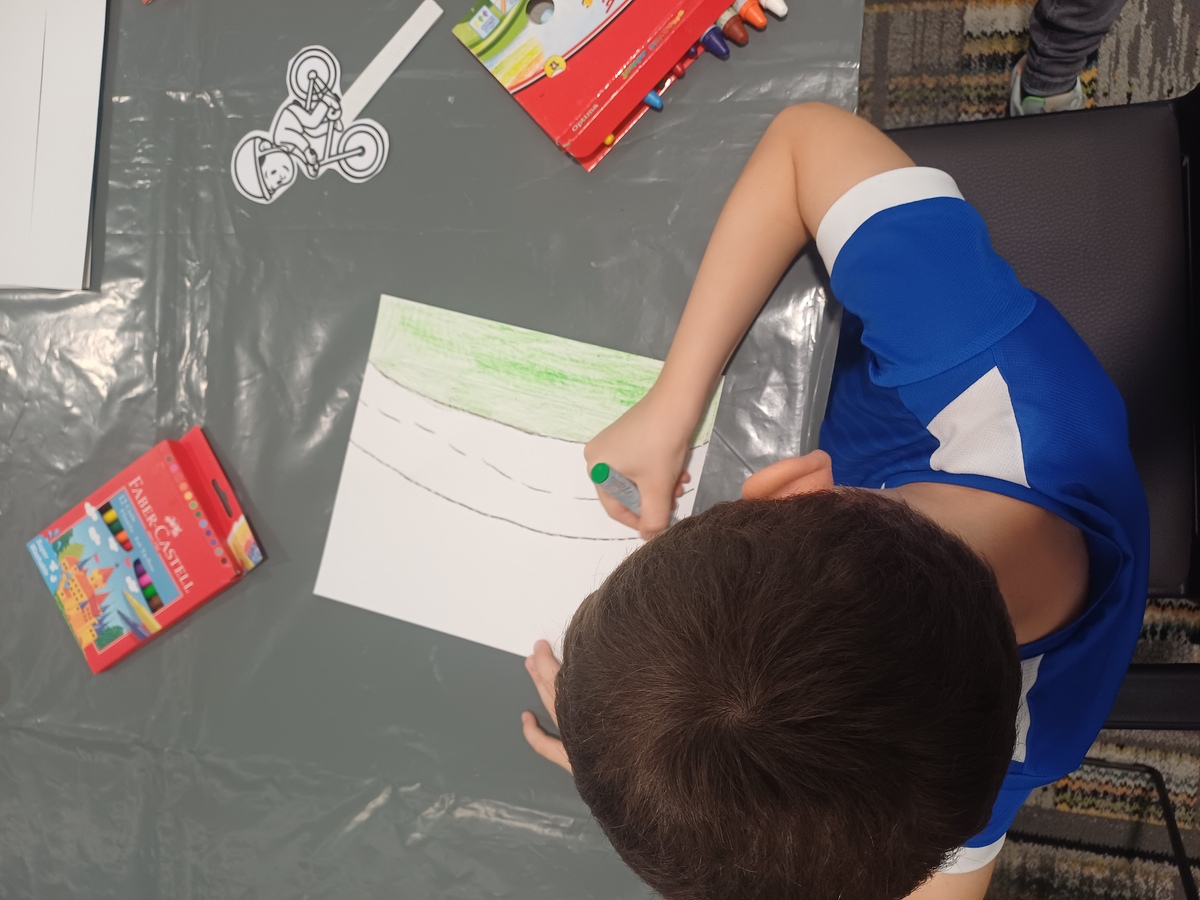 Po koncu pravljice so ustvarili svoje kolesarje na papirju, jih ponosno razstavili in odnesli domov – kot spomin na dan, ko so bili del nečesa večjega. 🐺🦔🐇🚲📚